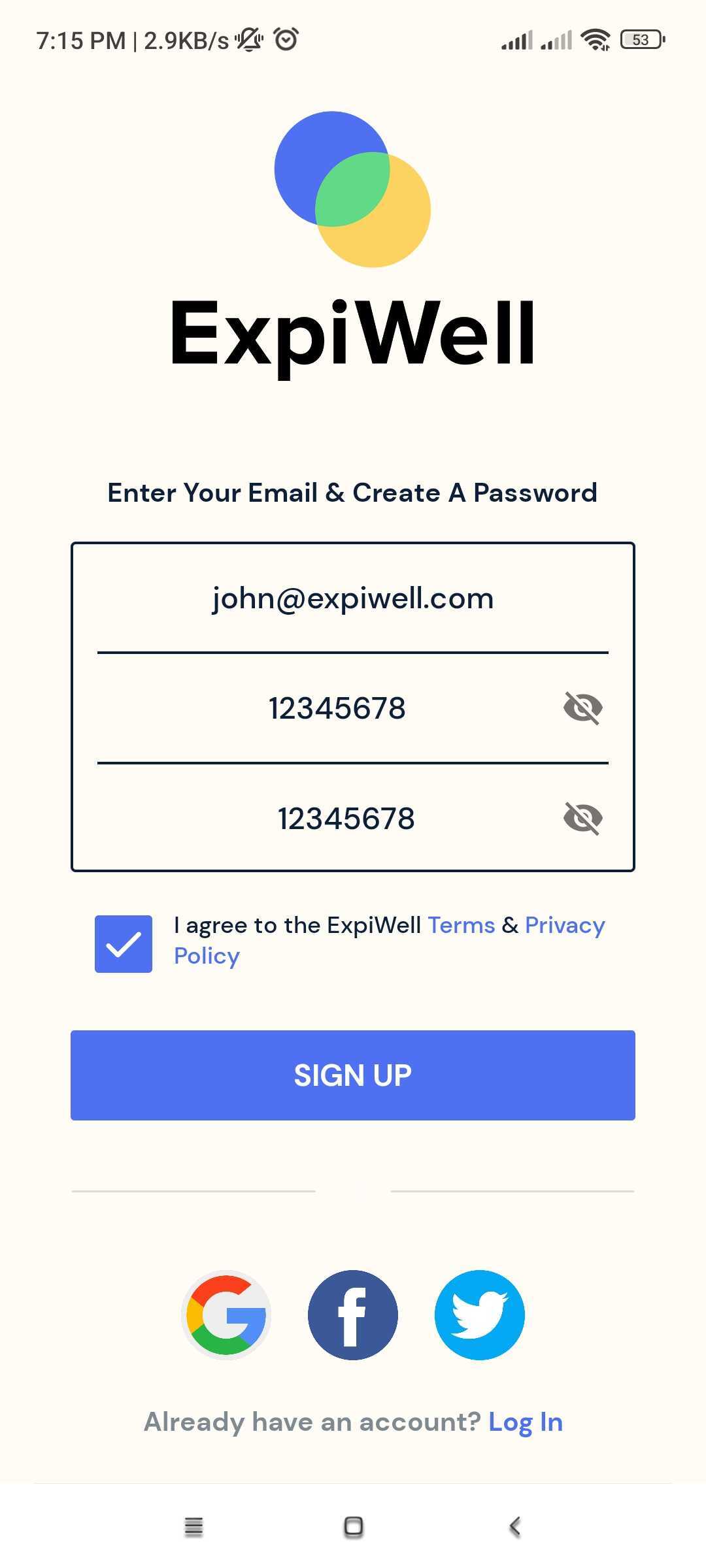 1. Click 'Sign Up' at the bottom of the screen (indicated by the red box).2. Enter your email address and your password. Also, read and check "I agree to the ExpiWell Terms & Privacy Policy," and click "Sign Up."