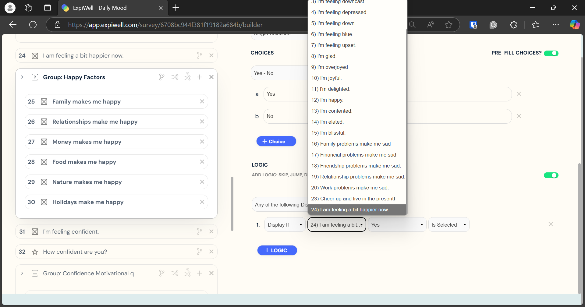Here, we have an example of a block display logic, where a question block titled 'Happy Factors' is displayed only if the response to the previous question, 'I am feeling a bit happier now,' is 'Yes'.