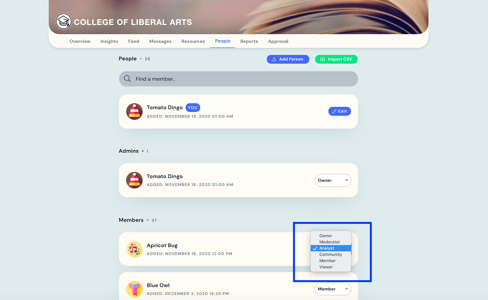 This functionality is crucial for maintaining an organized and productive community, especially as it grows and diversifies. Whether for moderating discussions, managing content, or leading projects, the role assignment feature ensures that every member can contribute meaningfully. The 'People' tab is not just about managing members; it's about harnessing your community's collective strength and potential, making it a dynamic and engaging space for everyone involved.