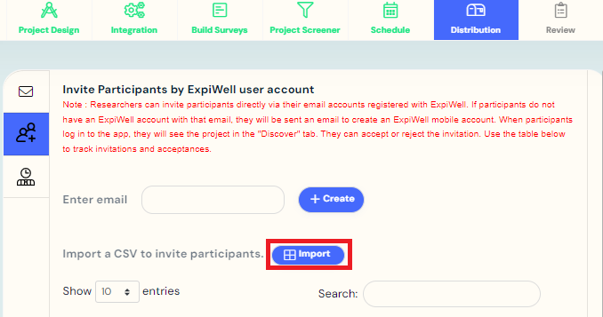 If you have a list of your participants' email addresses, you can also import a CSV file with their email addresses. Click on 'Import' to add your CSV file.